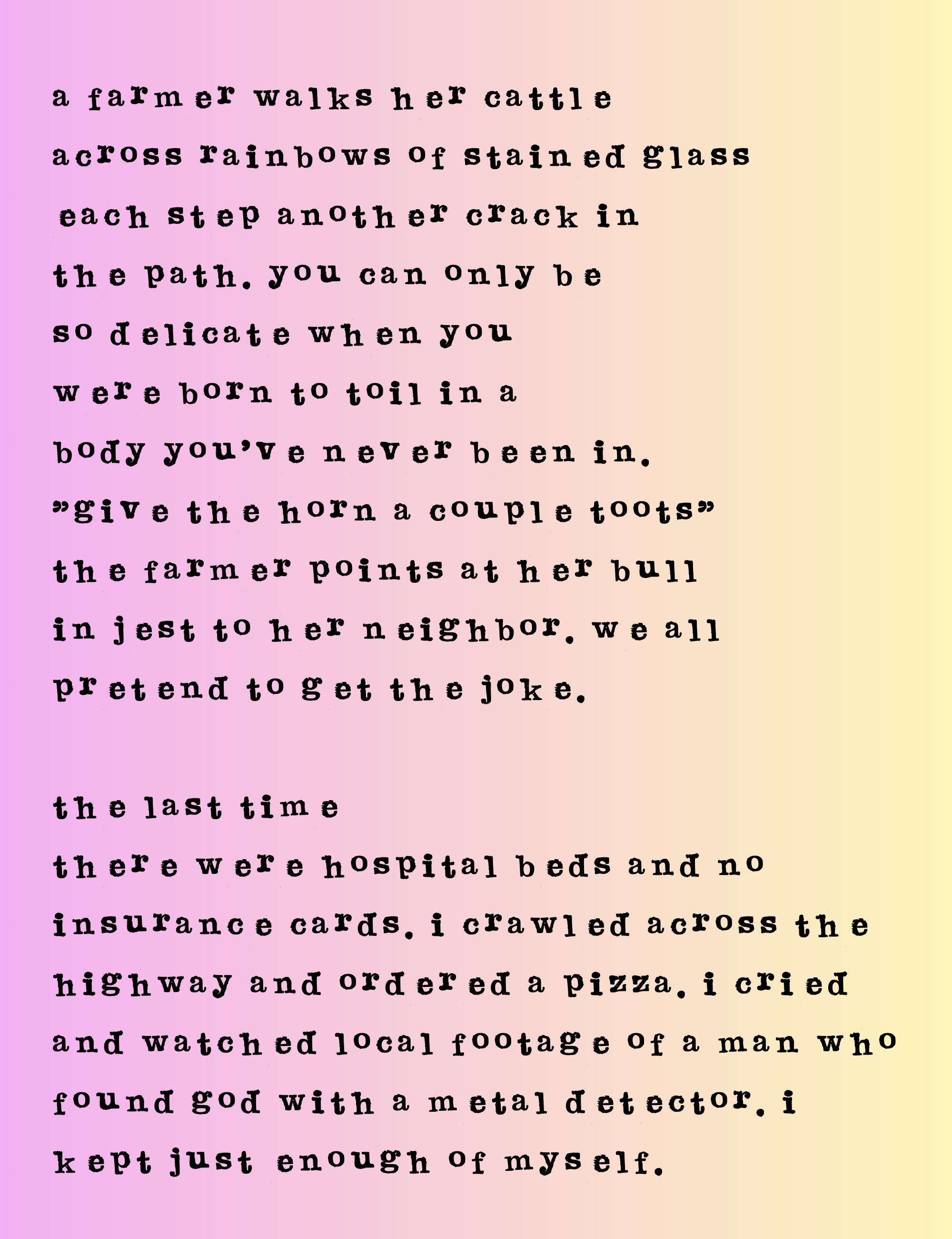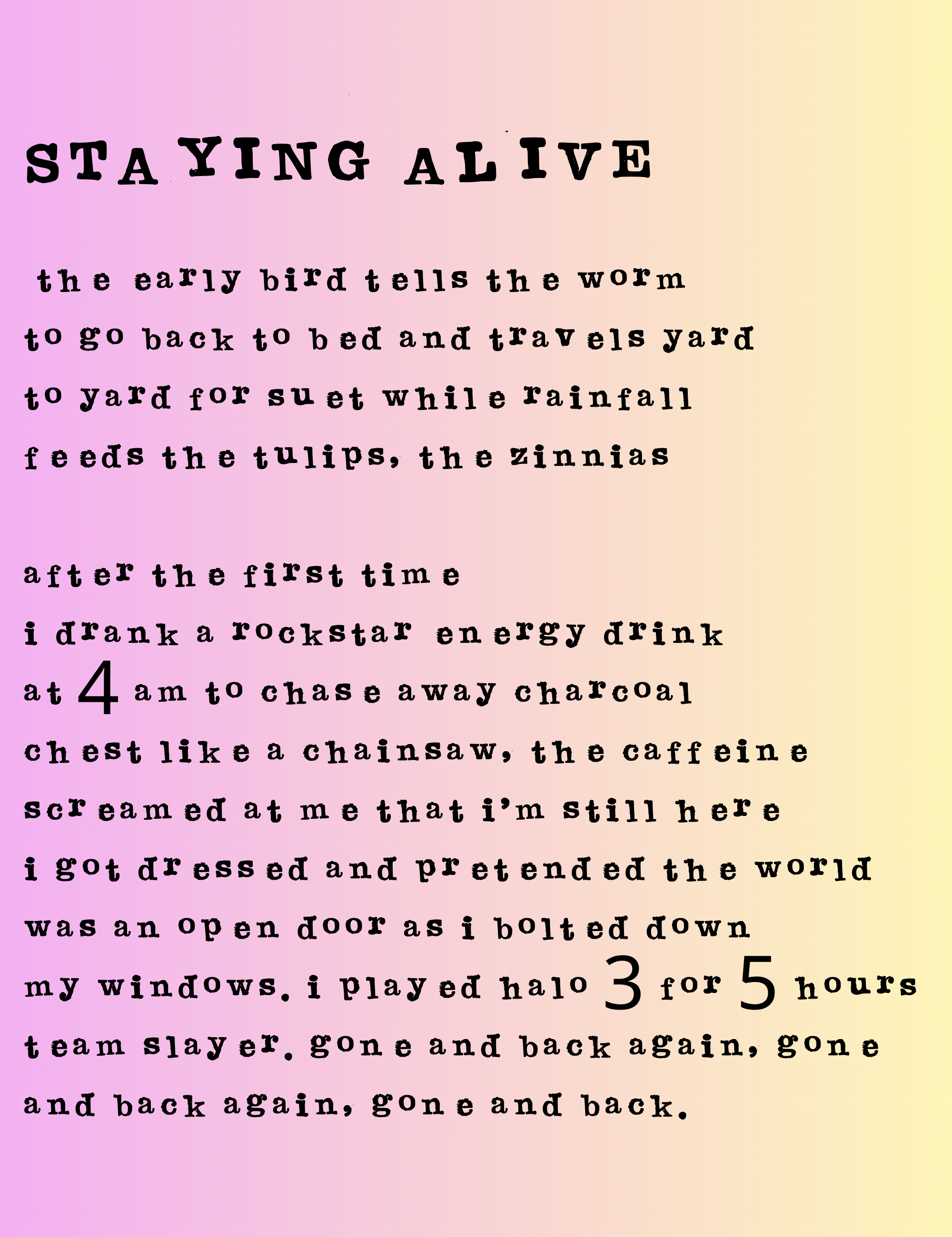 So, today is going to be mostly a poem-only day. It is a piece I have been working on as part of a bigger multimedia chapbook thing I want to make where each poem is represented and integrated into a larger painting/collage. I've had a lot of fun working on this project, and so I want to share a little but of it now. If I ever finish it, it will be a 4-foot ish tall canvas with lots of dumb happy meal toys and weird Guiness World Record cutouts and poems and all sorts of whacky stuff all over it. For today, here is a poem-in-progress that I consider a bit of an anchor piece for the project. This is kind of the poem that made me realize what the project actually is, or what I want it to "say" or whatever the hell. It is called "Staying Alive" and I hope you like it.
