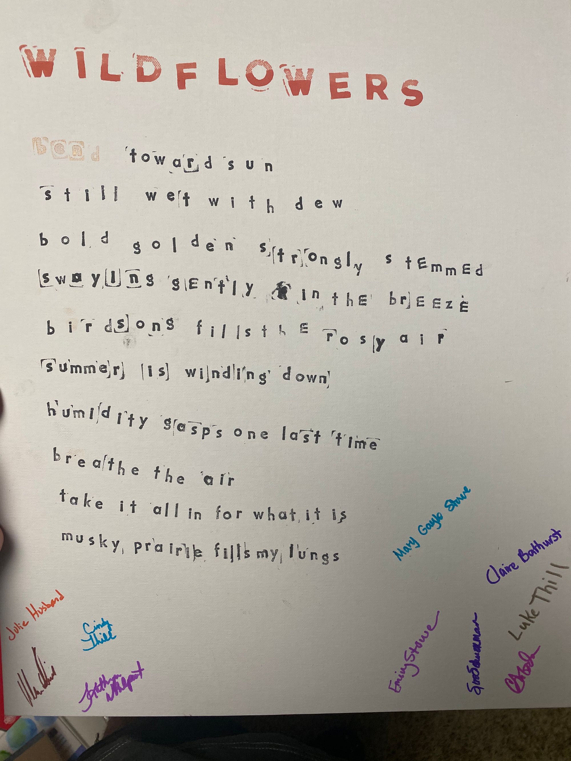 And to go out on, I do want to share one thing from this past weekend's workshop. As a group, we wrote a collaborative poem, and a participant and I inked it. We didn't have time to adorn it with anything besides the text, so I am going to put a couple more finishing touches on it before it goes back to live at Hartman, but here is what it looks like right now. I really love how the poem turned out. Even though each line was written by a different person shaped by different sets of life experiences, it all comes together as a cohesive whole. It moves, but rests well in a sense of community. So thank you again to all who participated.