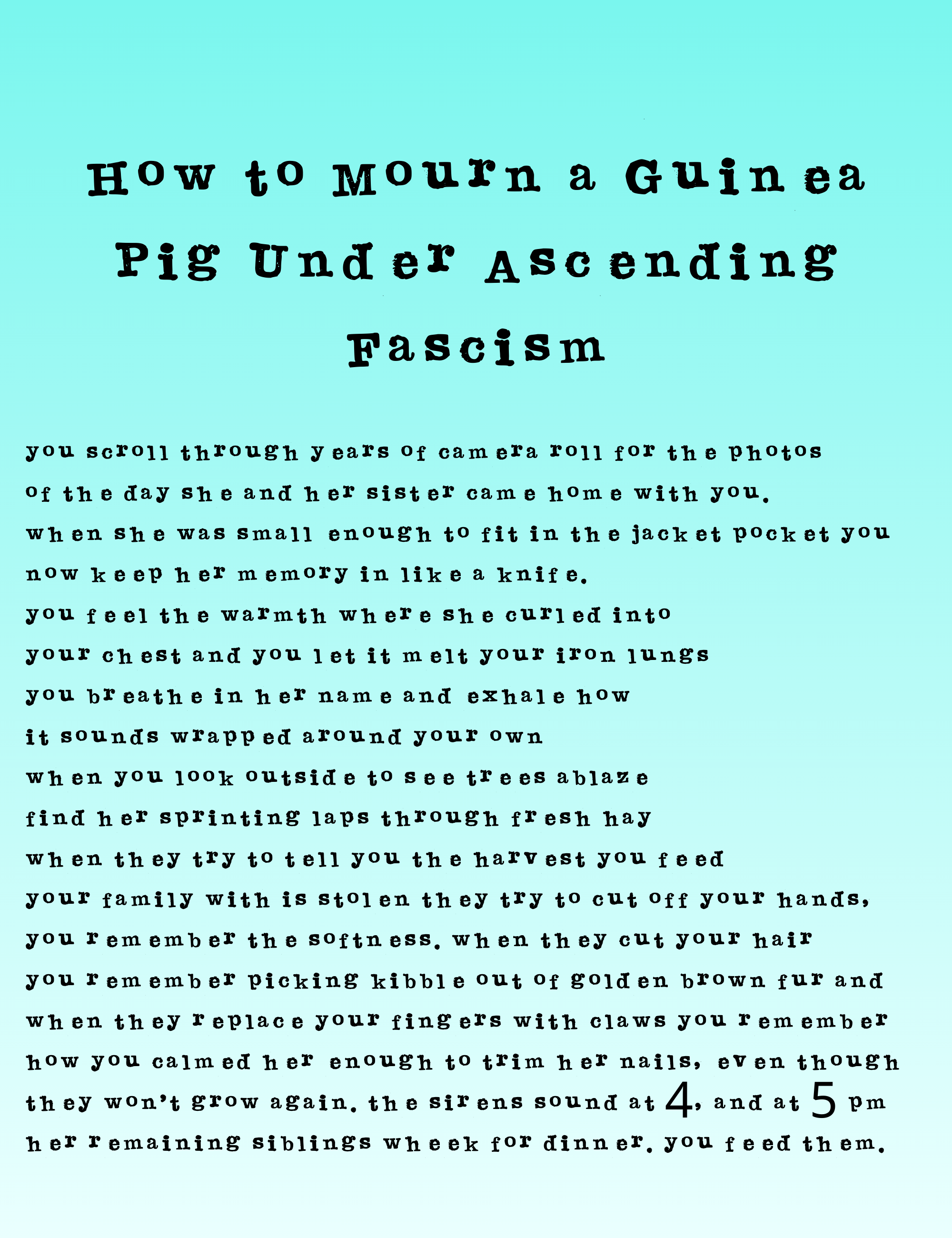 But what do you do with this kind of loss, these feelings of grief that, all things considered, could be much heavier? How can your world stop for a 4 pound rodent while the world around you is burning? I don't really know, besides that it just has to. More than ever, it is important to feel, and it is important to honor the care and joy that we put into the world. What we are seeing right now is an antisocial faction of our society staking claim to everything they can, so that they do not have to care for or about other people or other living things. It is pure Id, and it is, again, deeply deeply stupid. Because man, what the fuck else is there that is worth anything? Dumb assholes throughout history (or at least my lifetime) have tried to position being cold, aloof, and uncaring as this maximally efficient Brain-Genius personality type that leads to power and satisfaction. And well, a lot of these dorks have power, I guess, but I can tell you they will never be satisfied. You cannot opt out of caring for the world around you and still be satisfied. Nothing will ever be enough if loving your neighbors isn't. If you don't subscribe to the human experiment for the promise of being able to feed your neighbors, human, guinea pig, or otherwise, you need to listen to me when I tell you you are fucking up. And what all this means is that even as we face down what looks to be inevitable collapse, you have to mourn your guinea pig. Because that is what we are here for.