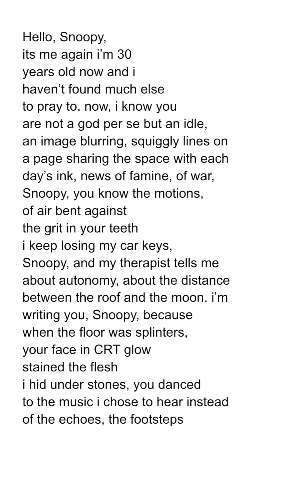 And like Snoopy, I learned to find serotonin in exercising my imagination. Like, Snoopy, the world famous author, I wrote dumb little short stories about life on mars and poems about my limestone rock collection. Like Joe Cool, I tried on more postured selves. Snoopy keeps himself open to invention and reinvention, and it was always really important to me to know that I could too. I couldn’t withstand the melancholy I shared with Charlie Brown, if not for the little acts of creation I admired his dog for.