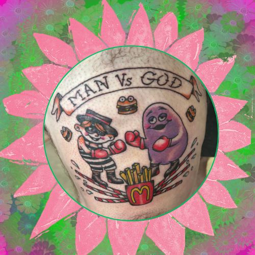 I would be remiss not to acknowledge the horrors. You know the ones. Let's face it, a lot of this dumb shit that you and I love is in one way or another the product of evil. Whether it be rooted in exploitation and the suppression of labor rights, in environmental degradation and destruction, in the growing pockets of the nastiest, evilest pieces of shit on this lil' blue dot, so many of our cultural touchstones and our connections to them feel so complicated and fraught, if not downright irredeemable. And so I do want to celebrate my love of tacky garbage, and I do want to legitimize and poeticize all the weirdest little parts of our day but I also want to look at the tension between our joy and these various evils. I'm trying to square away that so much of that joy across various stages of my life is built upon corporate monsters preying on me and other poor working-class people. Sure, I chose to get a tattoo of The Hamburglar boxing Grimace on my thigh as an adult, but one Mister R. McDonald is the one who dangled a shitty little Transformers toy in my 5-year-old face and got me hooked on McDoubles.