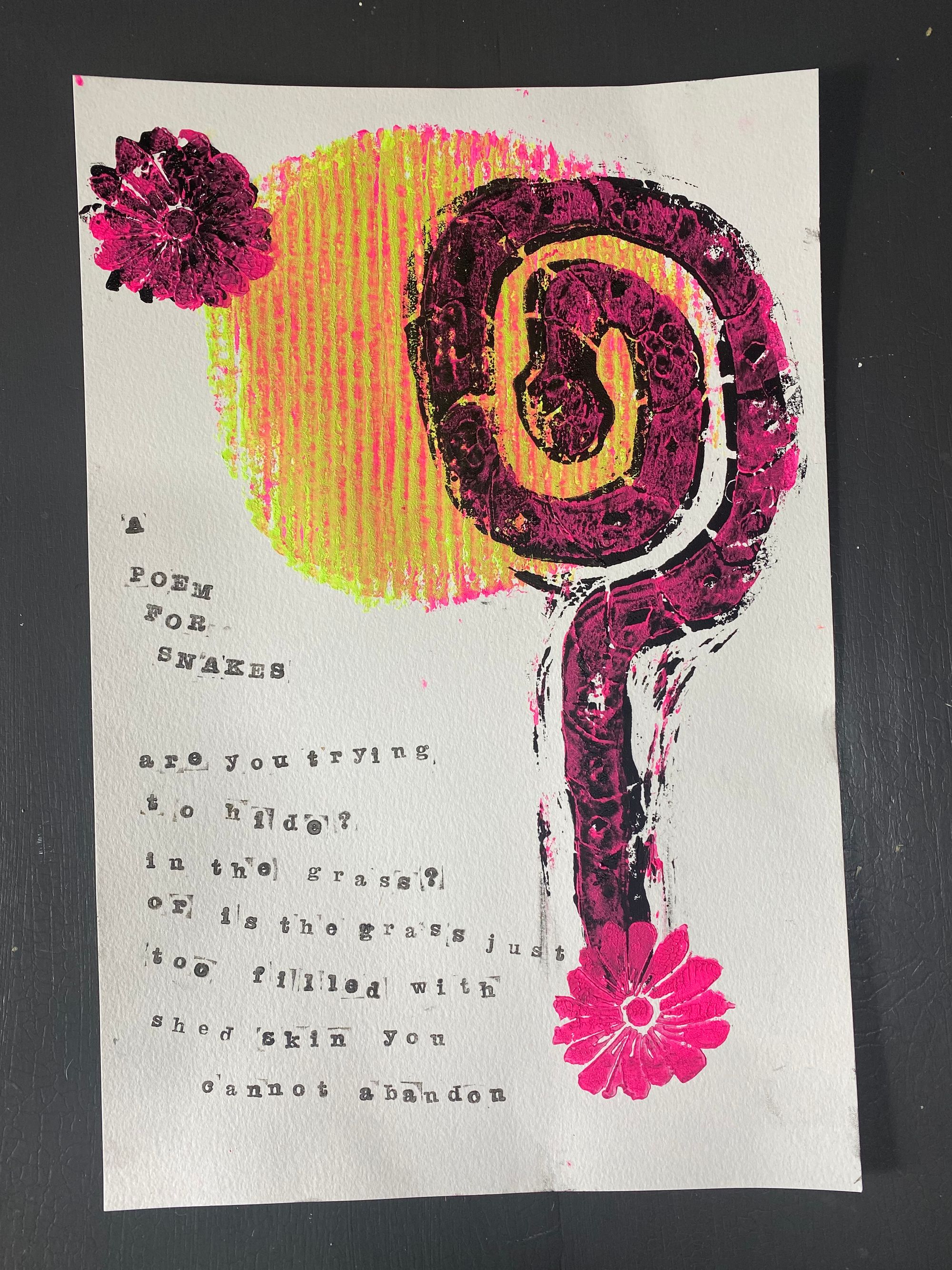 I have never been the best drawer, or painter, or anything that requires too steady of a hand. But that is part of what is nice about printmaking, and particularly with printing poetry broadsides. To me, what is more interesting is what you can do with the composition of the page. The deliberate selection of color to evoke the emotion of the written piece. The balance of negative space to positive. So if you're self-conscious about your artistic skil, please don't be! I've tried my best to make this very accessible to artists of all experiences.