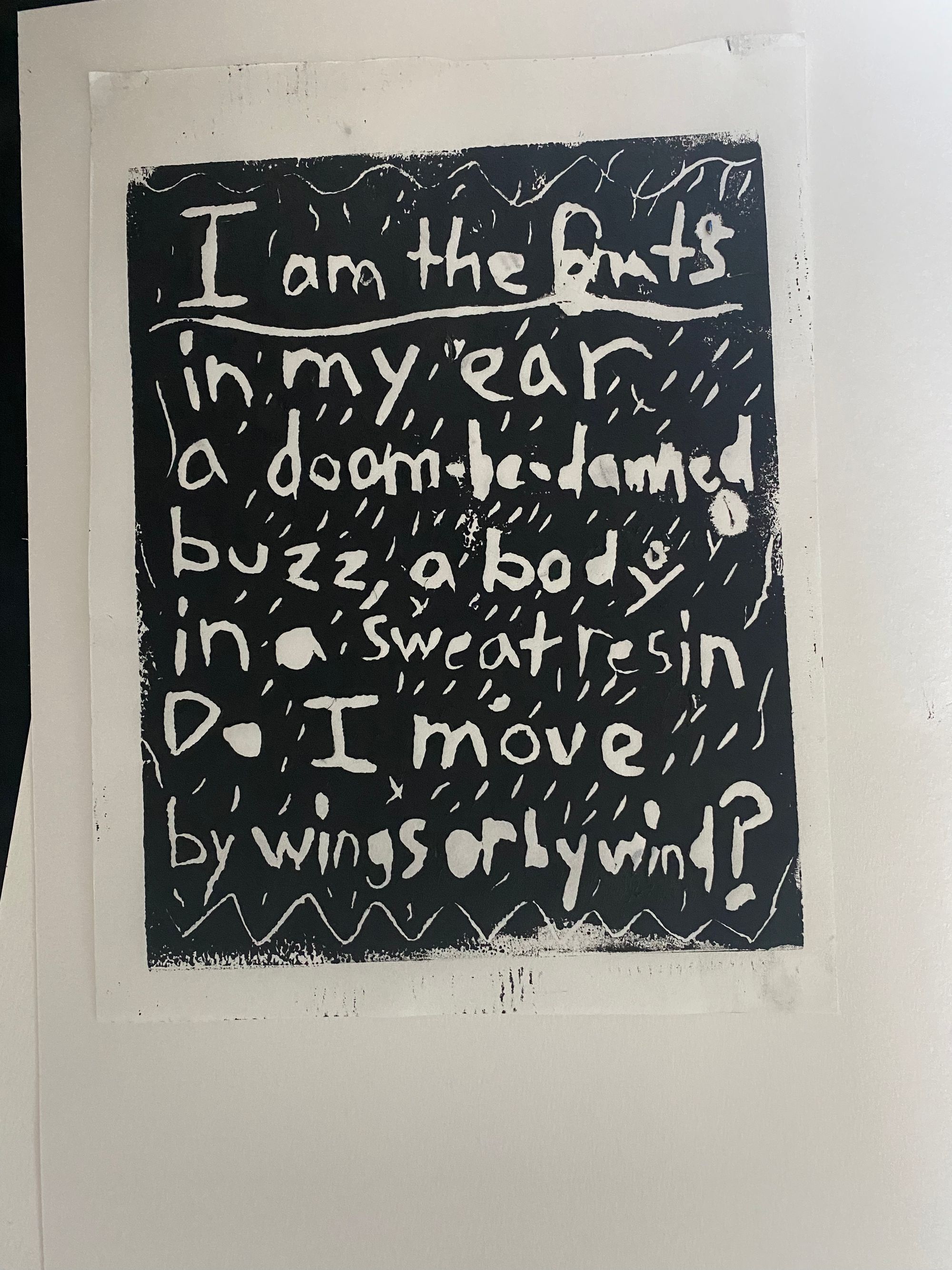Fast forward a few years to this past Spring when I am, as the kids say, bored. As I sometimes do when bored, I decide for the 500th time in my life that I am going to get serious about teaching myself how to paint. For real this time. I pull out my phone to look up supplies on an art store website, when I see a linocut printmaking kit on sale on the homepage. I wish I could tell you there was more to this story than me going "huh why not?" and buying the kit. So I went "huh why not?" bought the kit, and made a couple little stamps and things and whatnots. It was fun! I decided to keep doing it, and when I saw the application period for the Visiting Artist program come around, I thought continuing this hobby was the perfect way to complement what I know about poetry.